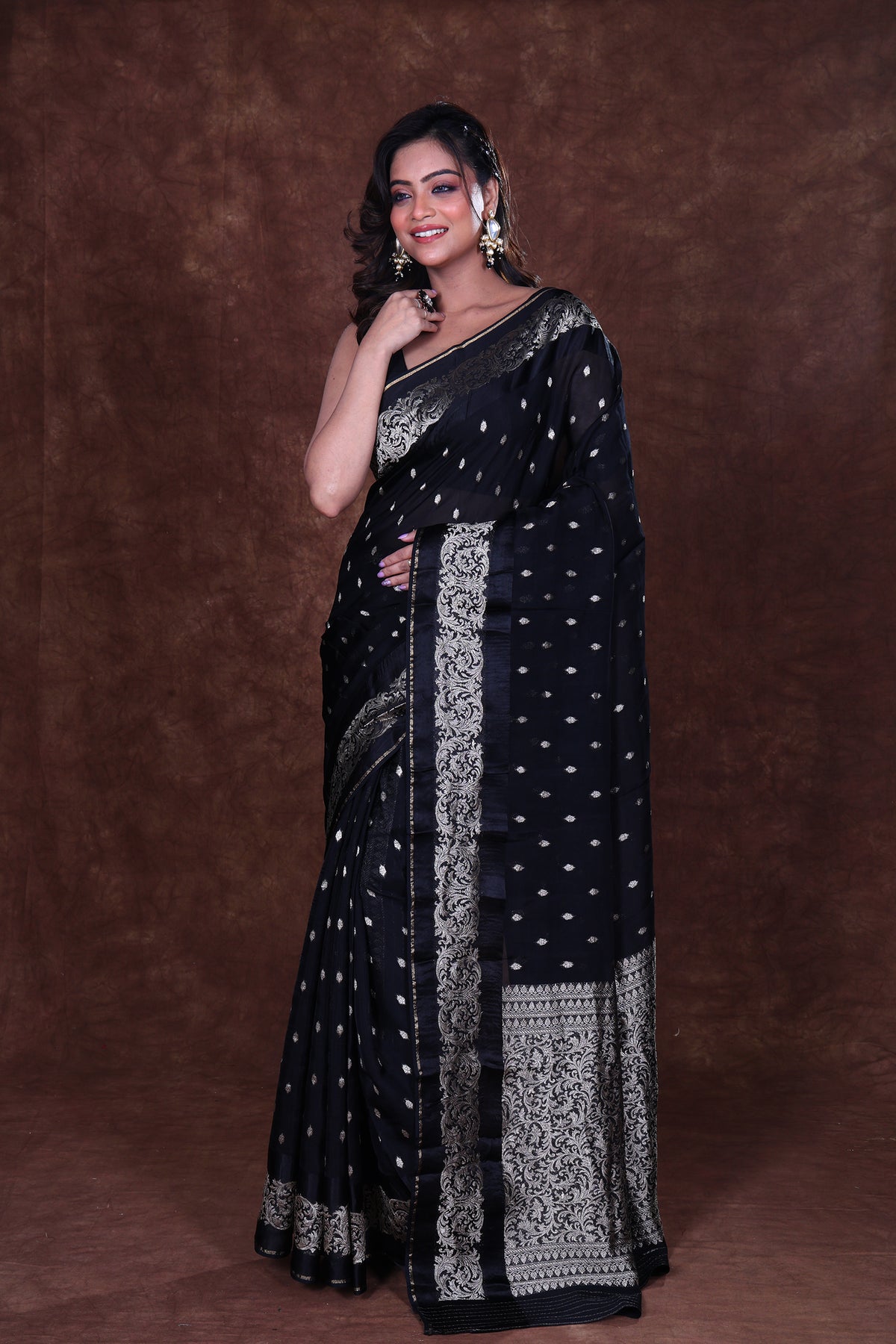 A saree made from semi-Kora fabric, which is lightweight and semi-sheer, combined with a glossy satin border that gives the saree an elegant, shiny finish.