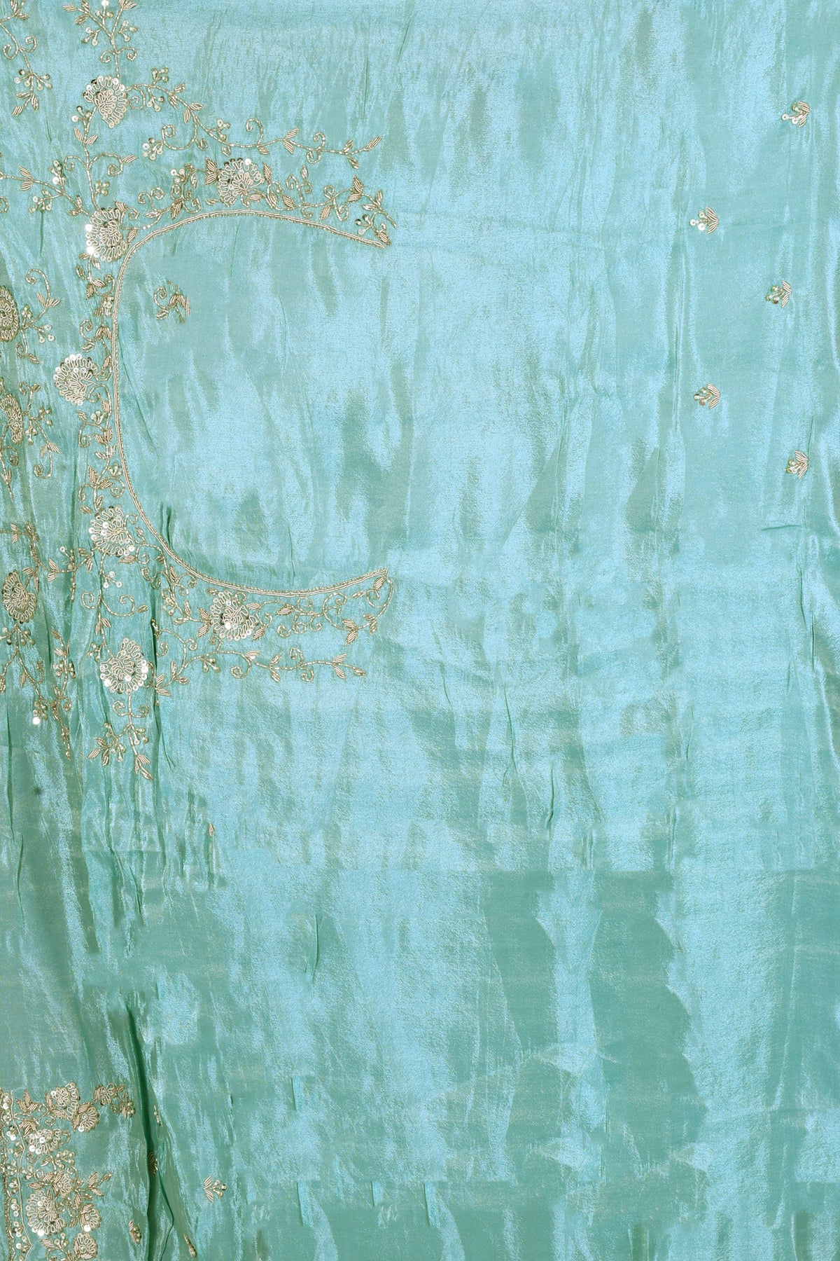 This type of saree would likely be chosen for formal events, weddings, or celebrations, as the combination of tissue fabric and Zardosi work lends itself to a stunning, opulent look.