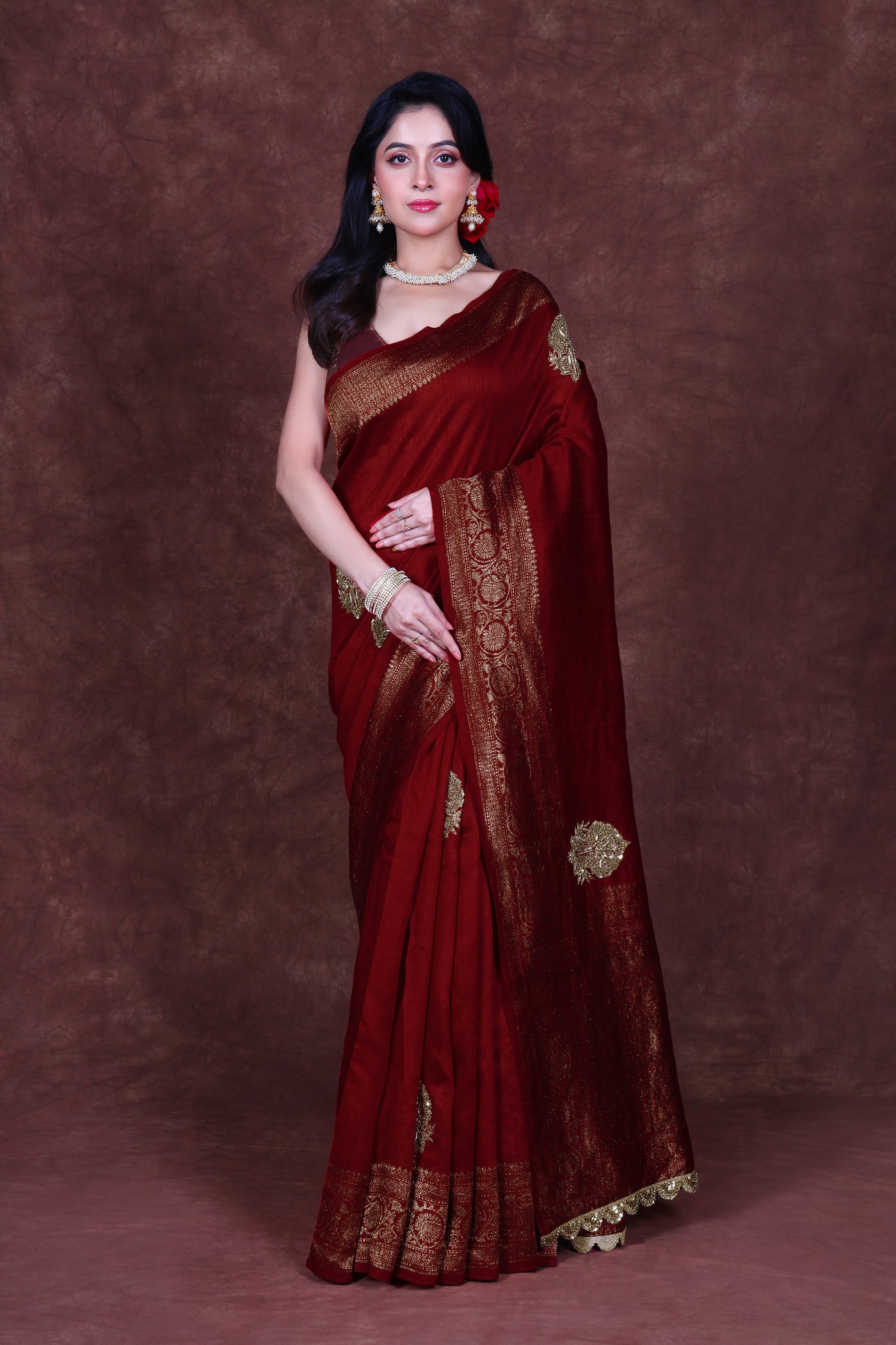 - Pairing this saree with traditional jewelry like Kundan, Polki, or Temple jewelry enhances its regal look. A well-chosen blouse, like a fitted silk or brocade blouse, complements the saree's intricate beauty.