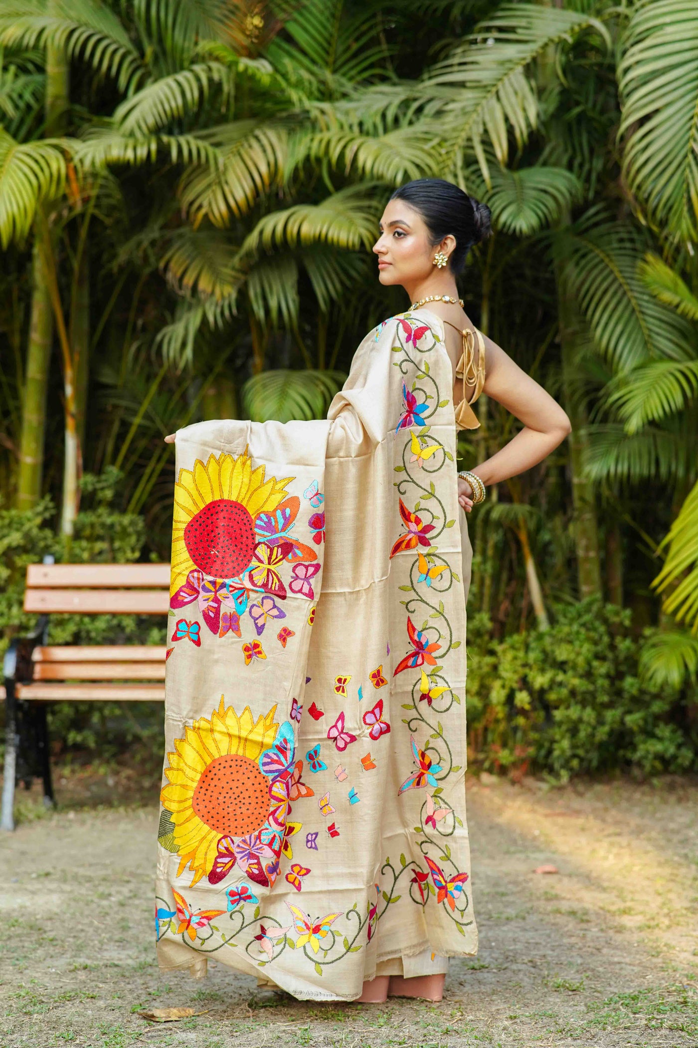 Beige Tussar Kantha Saree With Blouse Piece – Ethnic Boutique