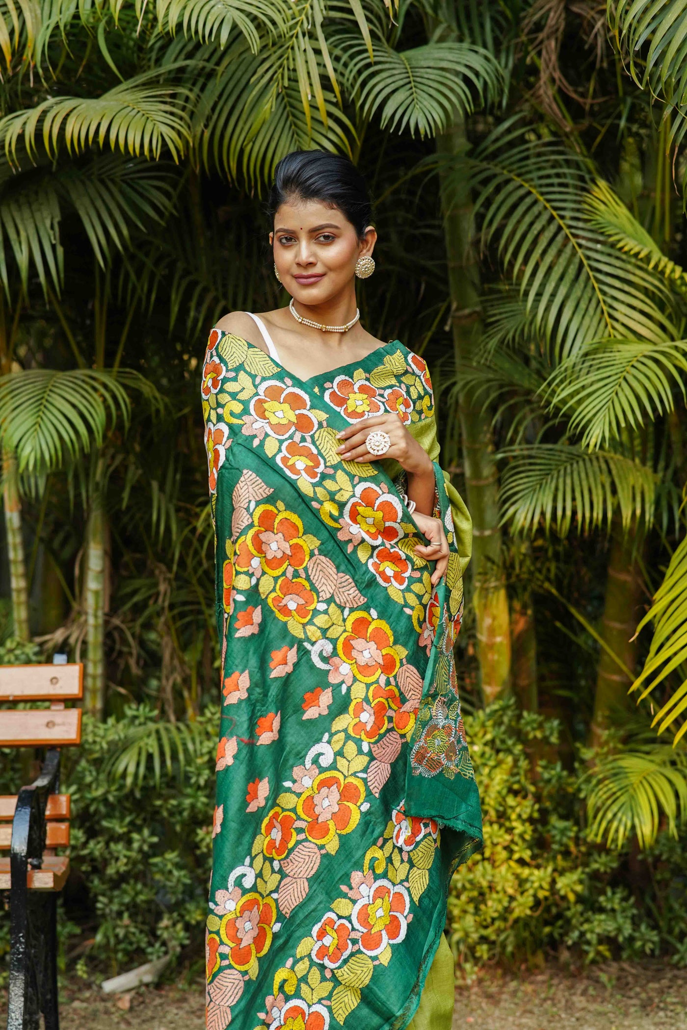 Bottle Green & Pista Tussar Kantha Saree With Blouse Piece – Ethnic Boutique
