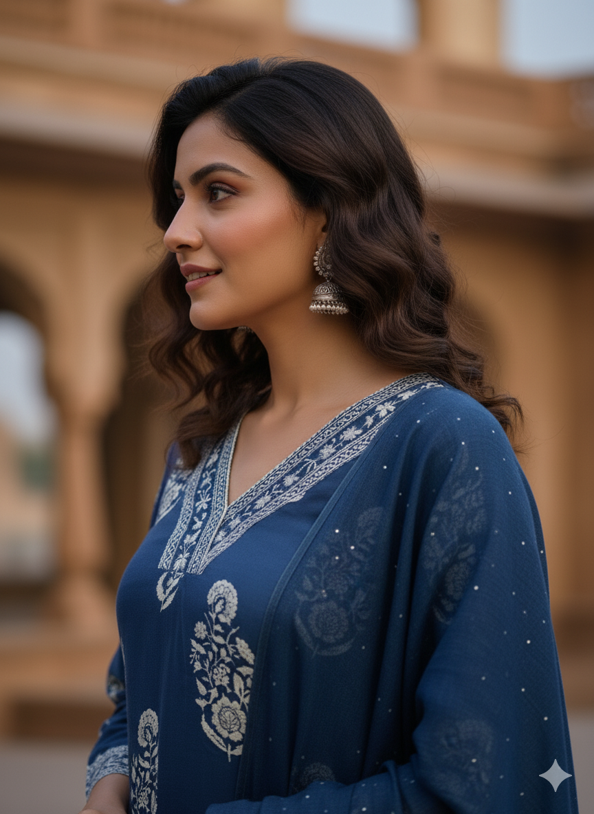 Festive wear: Embroidered or block-printed cotton sets with rich dupattas.