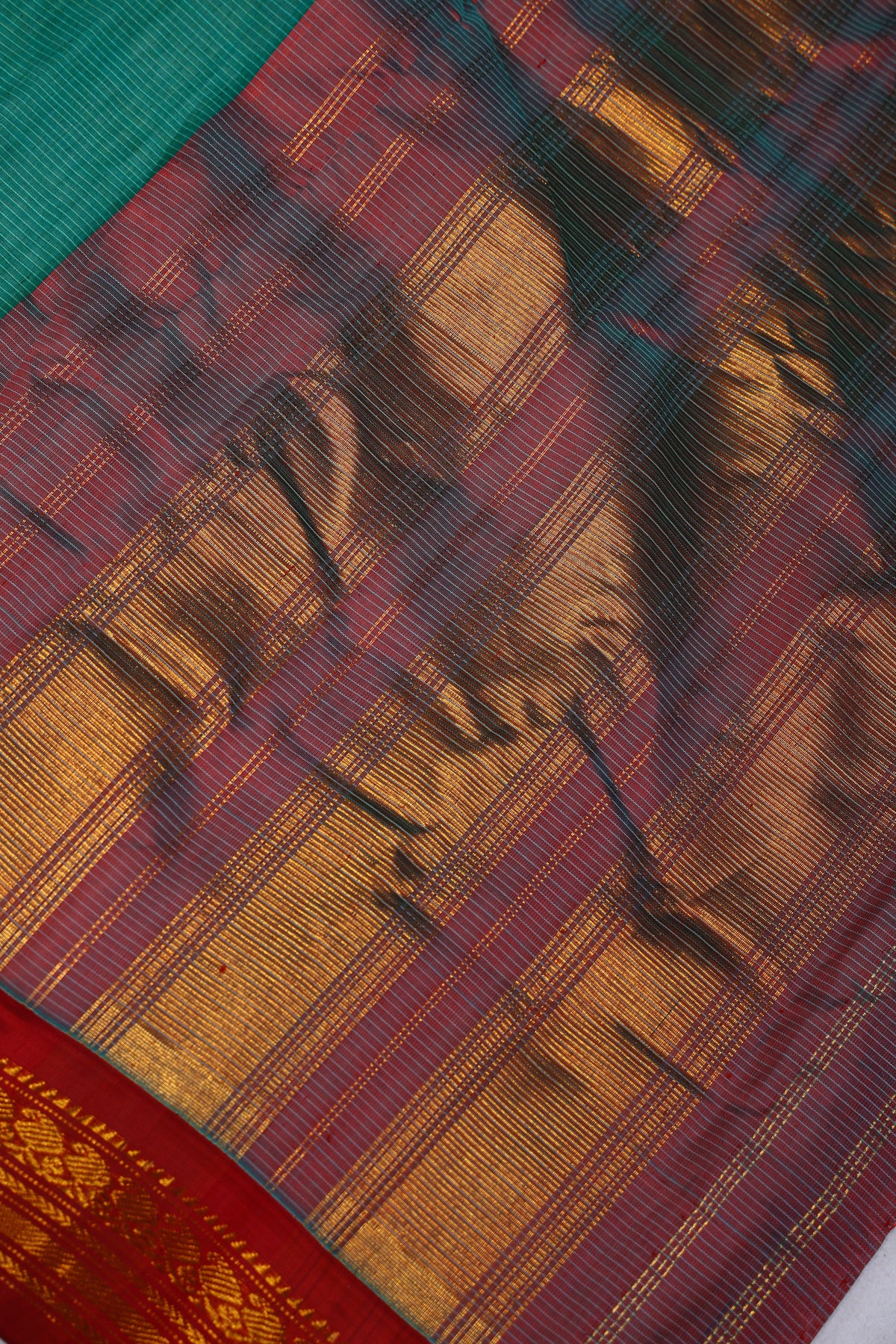 - Some Cotton Gadwal sarees may also feature checks or stripes in the body, which adds texture and depth to the overall look of the saree.