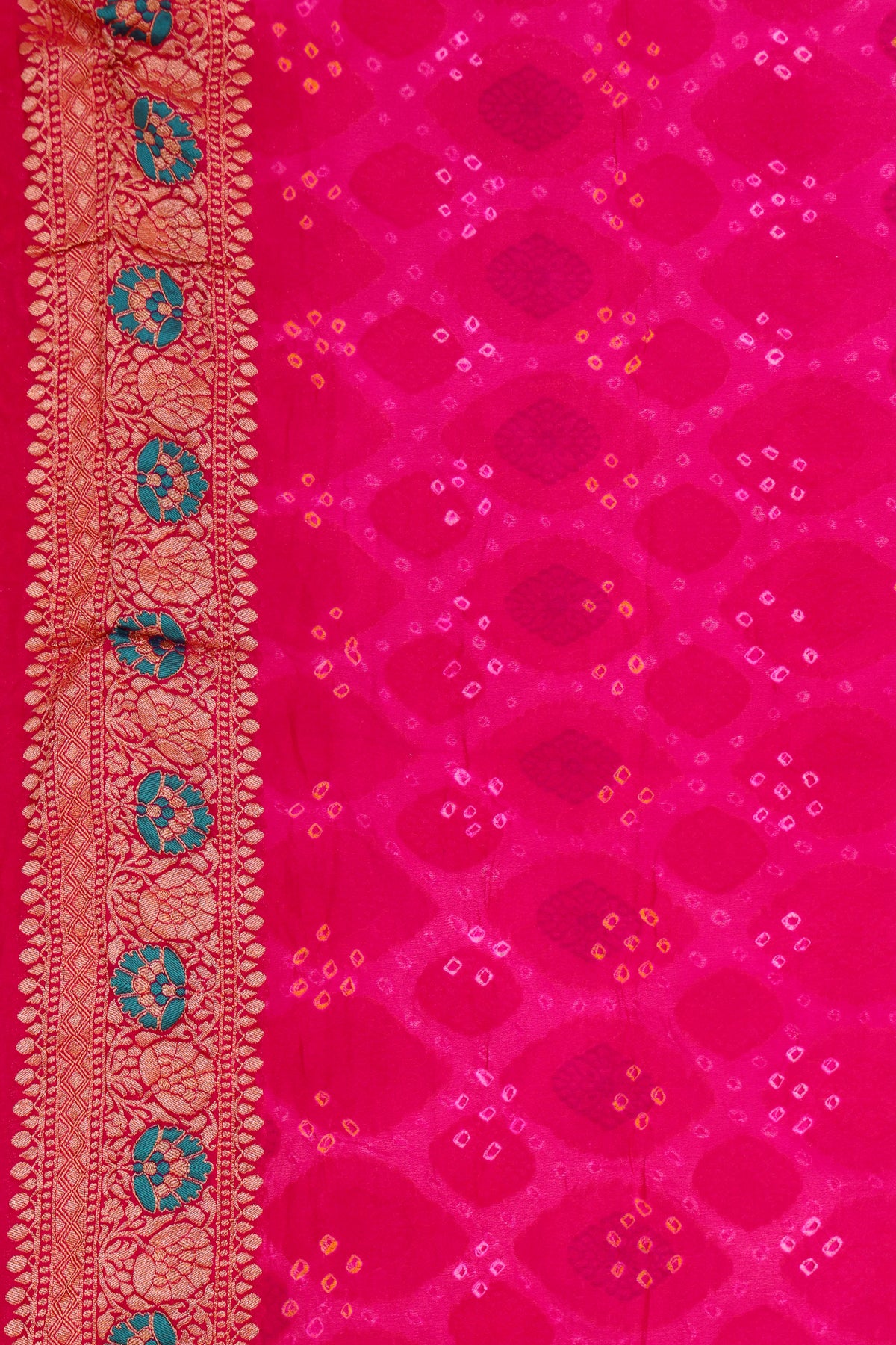 Process: The fabric (usually cotton, silk, or chiffon) is tied and then dyed in vibrant colors, often using natural dyes. The pattern created by the resist-dyeing is a defining feature of Bhandhej sarees.
