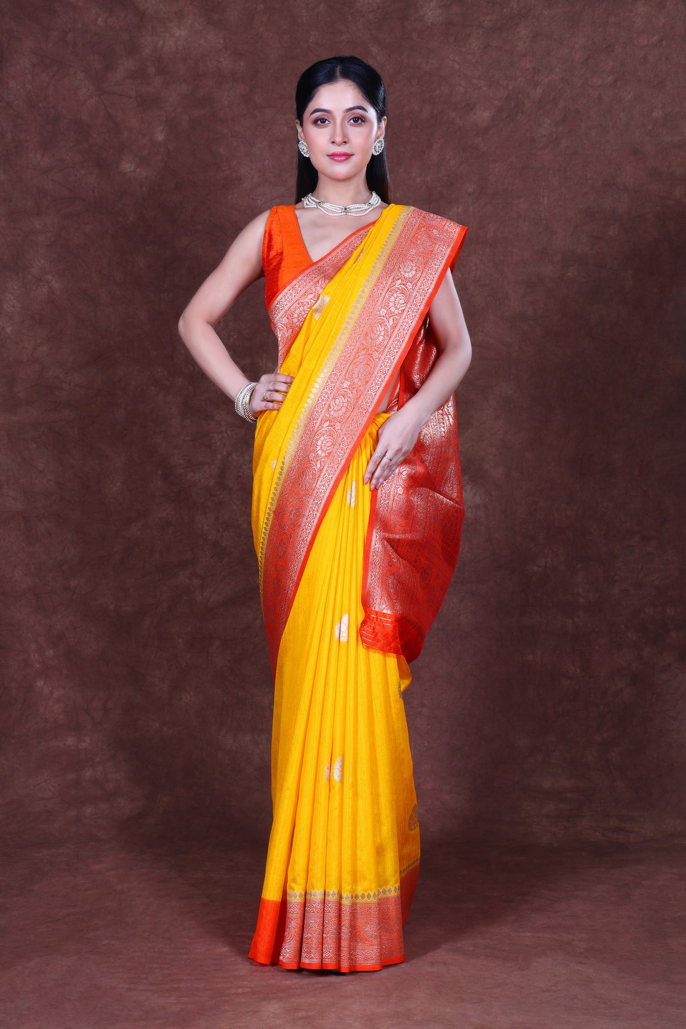 The fabric is also breathable and has a slightly matte finish, making it ideal for summer wear or warmer climates. It is often used in making traditional sarees for weddings, festivals, and special occasions.