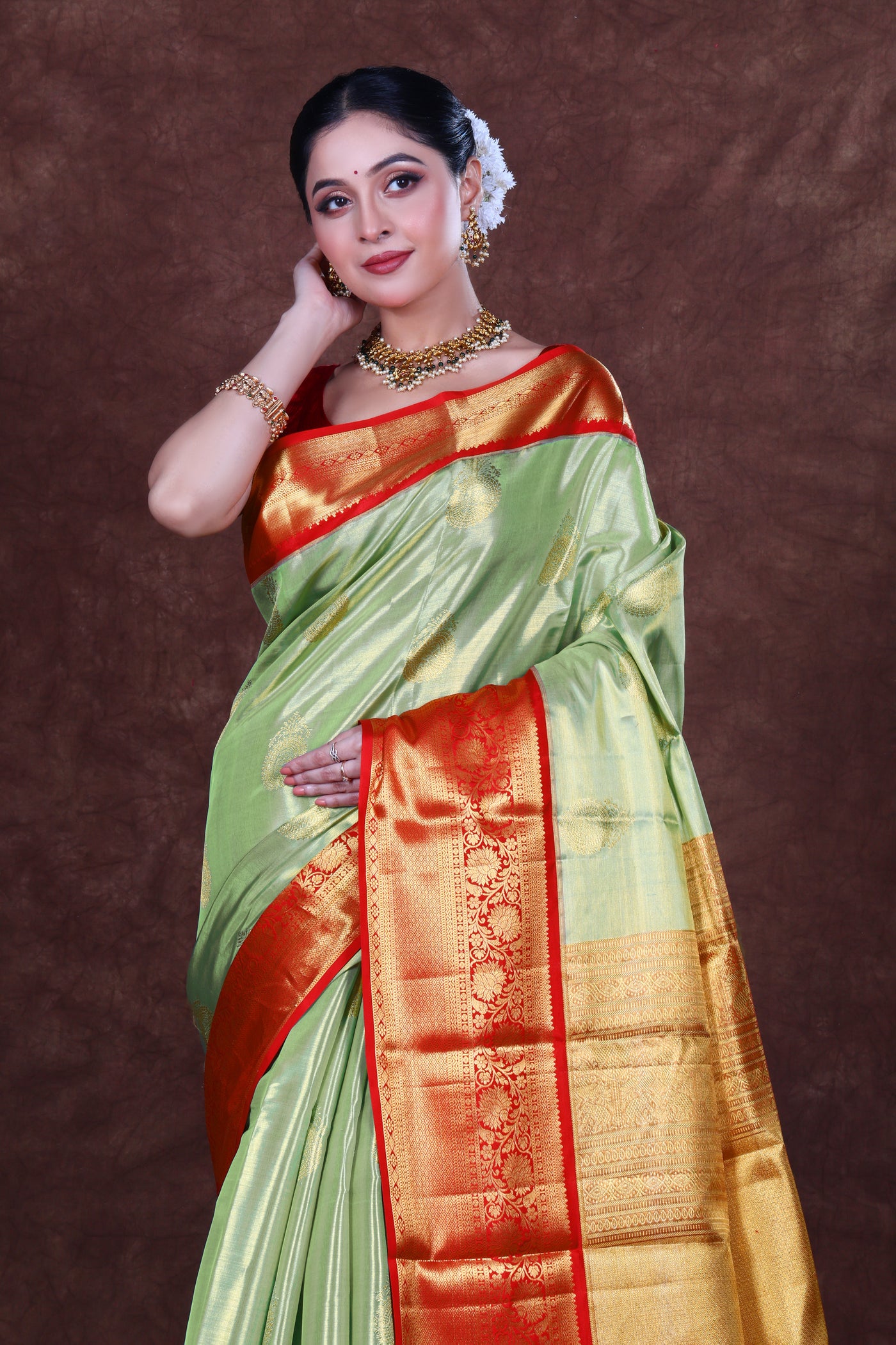A Tissue Kanjivaram saree is a luxurious variation of the classic Kanjivaram (Kanchipuram) silk saree from Tamil Nadu, woven using silk threads interlaced with zari, giving it a sheer, metallic, tissue-like sheen.