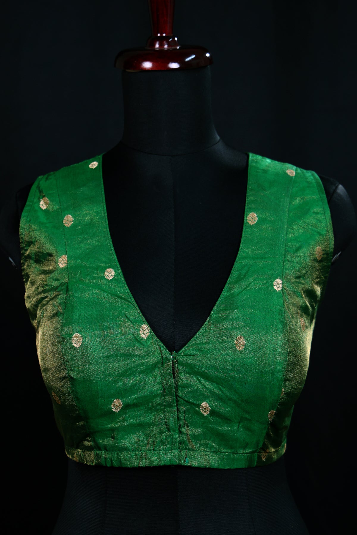 A tissue Katan sleeveless blouse is a chic, luxurious garment made from tissue Katan silk, combining the delicate, metallic sheen of tissue fabric with the rich texture and durability of Katan silk. This blouse is perfect for festive occasions, weddings, or elegant gatherings, offering a contemporary twist on traditional Indian attire. Here's a detailed breakdown: